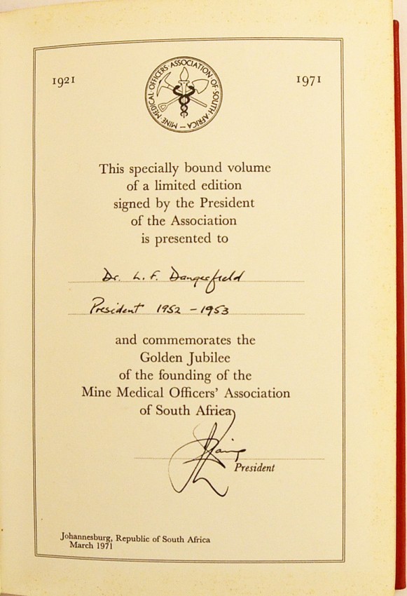 No. 31 of a limited de-luxe edition of 45 copies in gilt decorated full leather (or ? faux leather) binding. An inserted leaf indicates that this copy was presented to Dr. L. F. Dangerfield, President 1952-1953 of the Association. Signed by Dangerfield on the front free endpaper and additionally signed by the author, J.P. Cartwright on the title page.