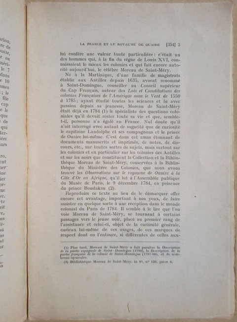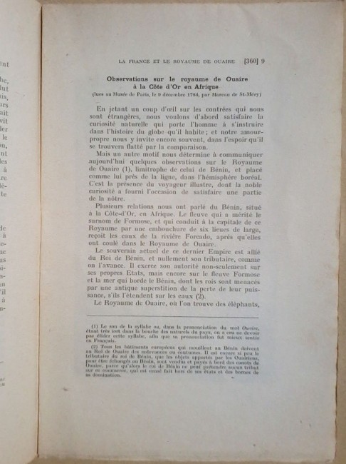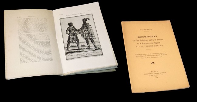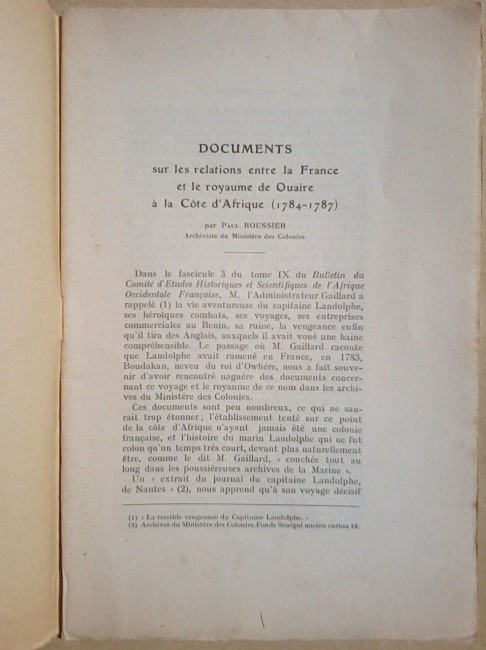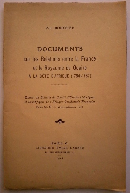 "Documents sur les relations entre la France et le royaume de Ouaire à la côte d'Afrique (1784-1787). Extrait du bulletin du Comité d'Etudes historiques et scientifiques de l'Afrique Occidentale Française. Tome XI, N°3, 1928"; Paris, Librairie Emile Larose, 1928 (1st Edition); Softcovers; in-8°; Text in French; Collation complete - 33 pages; Overall the condition is Very Good +.