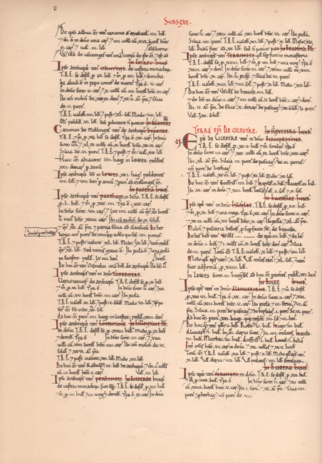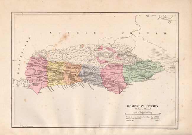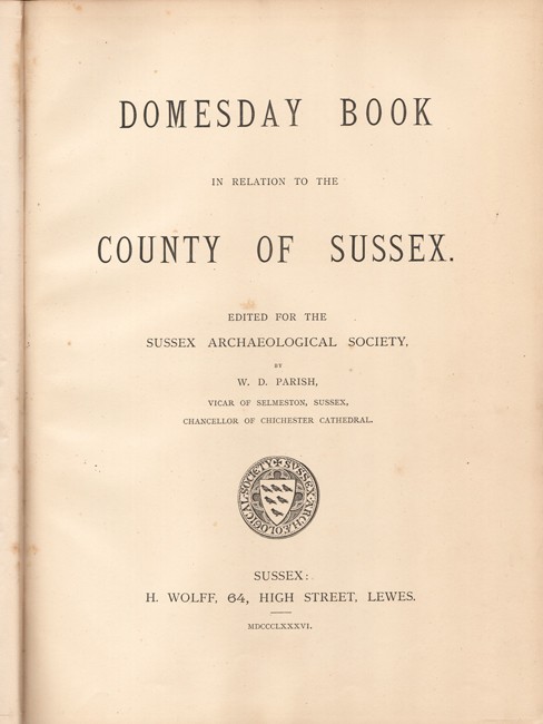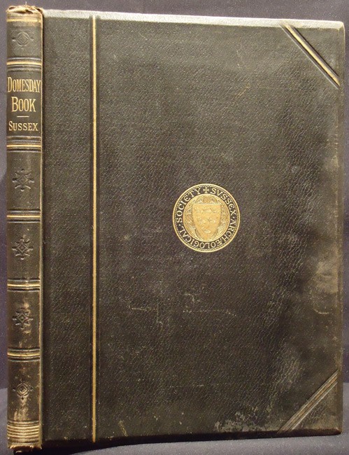 xiv, xxviii (Facsimile of the Original Record printed in red and black), 138 pages, coloured map as frontispiece, original black cloth over bevelled boards with the gilt crest of the Sussex Archaeological Society on the upper cover – the cloth is worn at the top and bottom of the spine and along the edges.