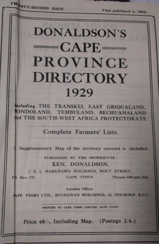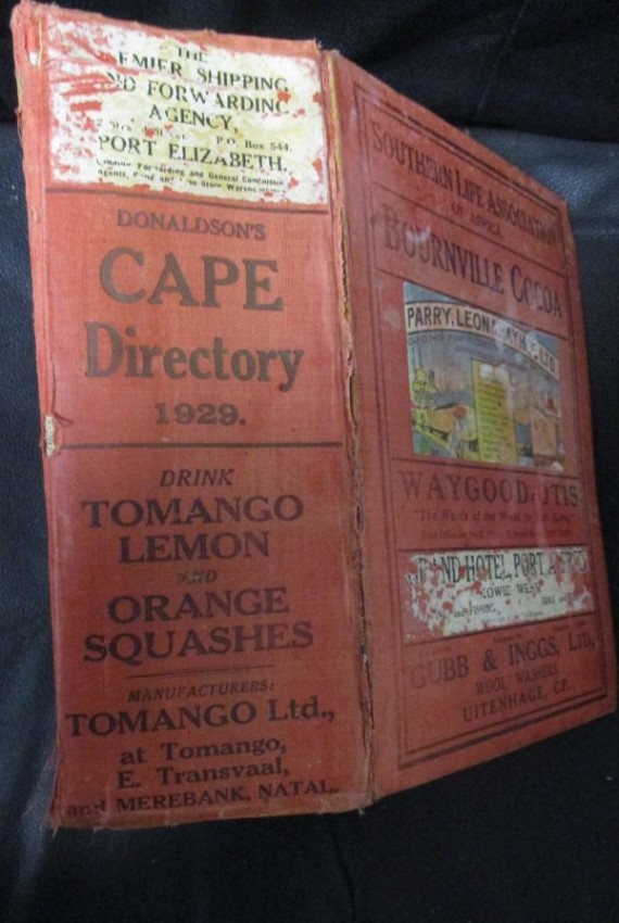 Information on Cape Town and Suburbs with residents names, and addresses, Building and Chambers with tenants names, Alphabetical list of Cape Town residents, and Traders. Towns and Villages in Cape Province, including Farmers lists and station code marks and so much more..... Advertisements throughout the book.