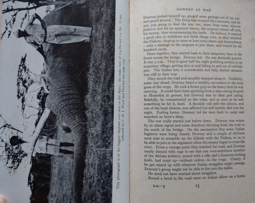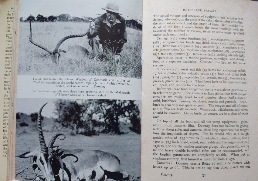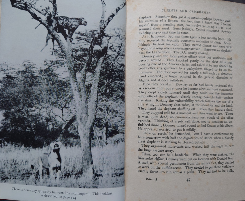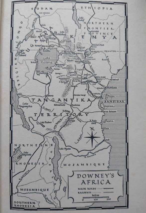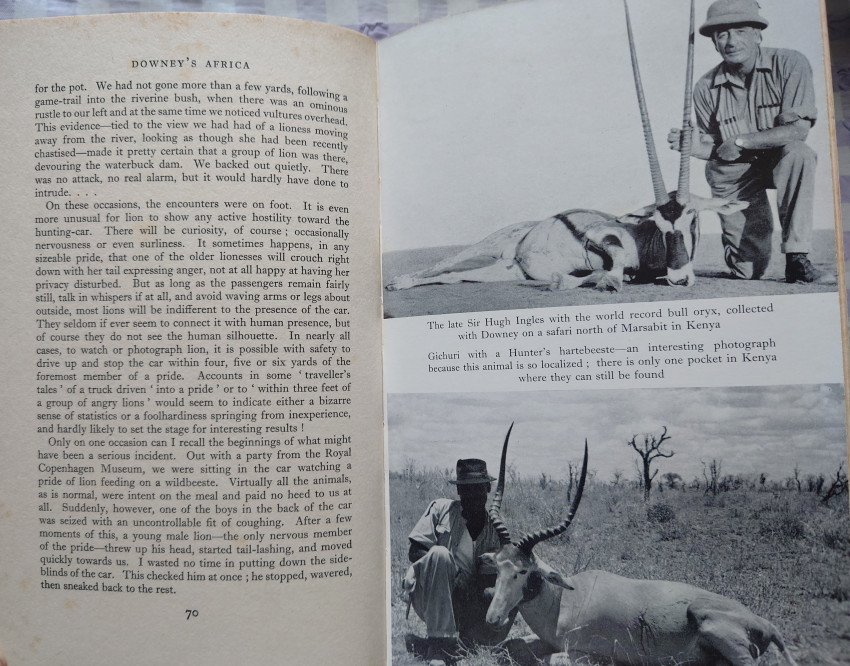 Hunting in Africa. "Downey is a white hunter; some say, the greatest since Selous. Like his brethren, he is as much a naturalist as a hunter. He loves East Africa and its wild life with a passionate but comprehending intensity."