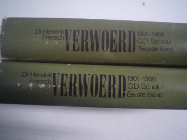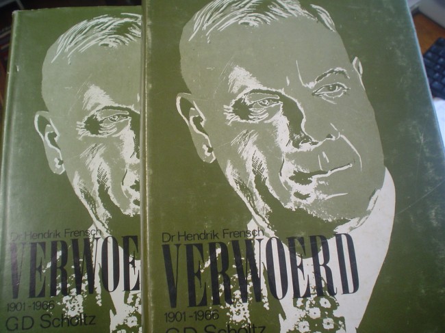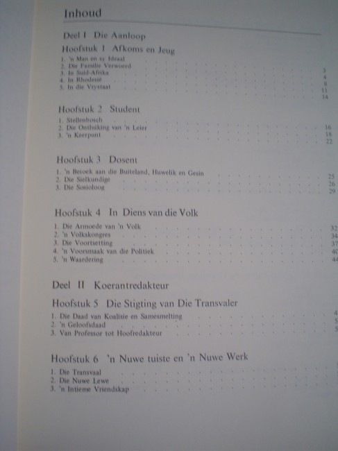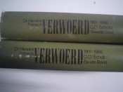 Pragtige boeke uitgegee in twee Bande. Ex-Libris plakker in beide voorin. 308 en 327 bladsye. Hoofstukke beskryf sy afkoms en jeug, student, dosent, koerantredakteur, stryd om die siel van die volk, stryd teen Imperialisme, Minister van Naturellesake, Bantoe in die Tuisland, lid van die Volksraad, Verwoerd die Staatsman, SA word 'n Republiek, Blanke eenheid, Rasseverhoudinge, SA en Afrika, tragedie ens.