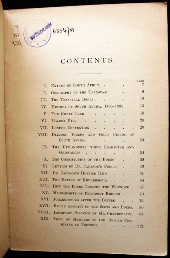 Very old former University of the Witwatersrand bookplate on the verso of the front wrap. Interestingly the bookplate states on the bottom edge that this was a donation to replace books destroyed by the fire at the University on 24 December, 1931 - the famous fire that destroyed the largest part of the Gubbins collection. There is also a small "withdrawn" stamp at the head of the contents page.