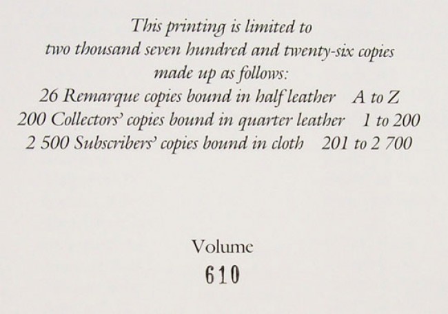 This copy comes with the loose insert bearing the copy number 610. An image of this insert is provided - lying on the front end paper. This insert, with a picture of eggs and ducklings in a nest, was supposedly issued with this edition, but many copies of this book seem to be without it.