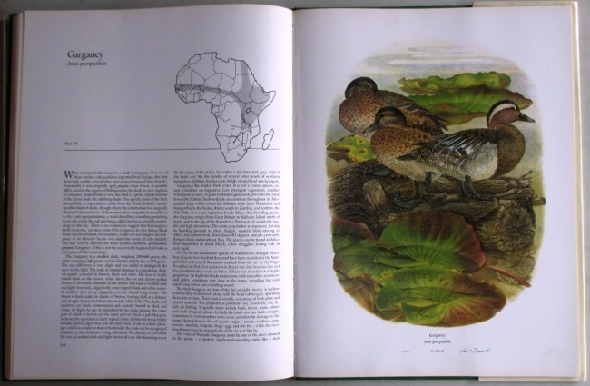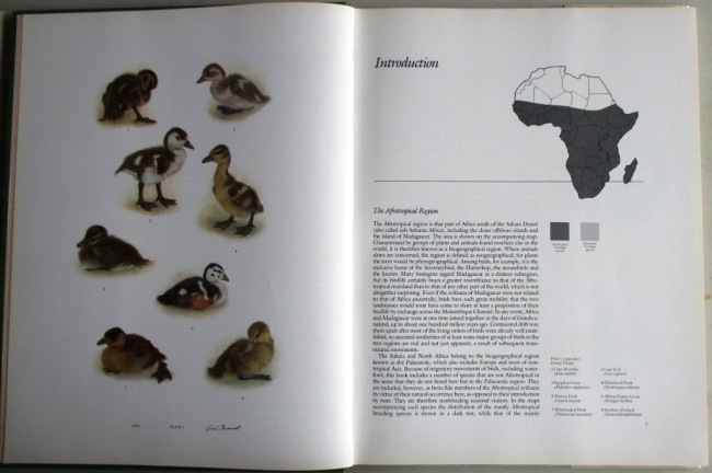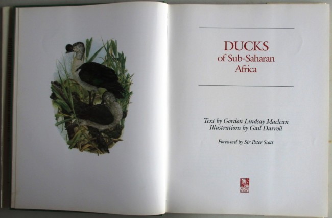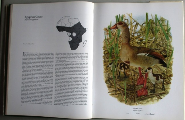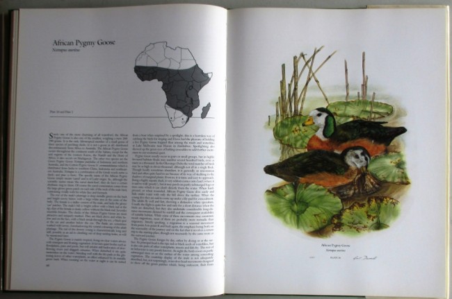Pages xv + 150. The book covers all thirty of the waterfowl species, both breeding and nonbreeding, found in Africa south of the Sahara. Thirty-six colour plates have been reproduced, the same size as the original watercolours and shows plumages and environmental features in an atmospheric blend of detail, colour and life.