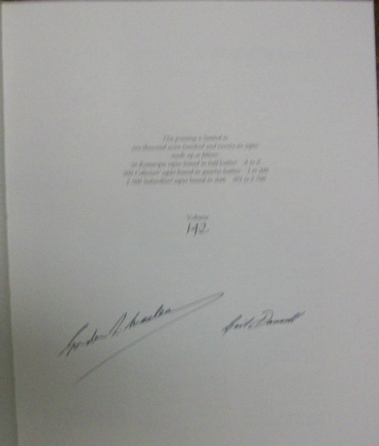 1/4 Leather bound & brown linen, gilt duck vignette to front linen board and with five raised ribs to leather-decorative spine with matching slipcase with gilt duck vignette. Collector's Edition signed by author and illustrator. 142/ 200 copies. With illustrated endpapers.