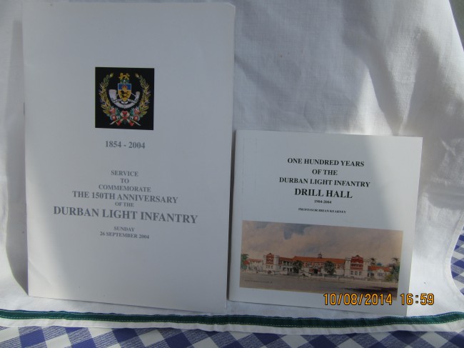 1. large 8vo, 8 page glossy booklet of the Service to Commemorate the 150th Anniversary of the Durban Light Infantry on Sunday 26th September 2004 with a list of COs & RSMs as well as Roll of Honour & the Order of Service.