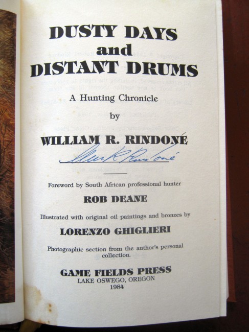 Signed on title page by author. Foreword by Rob Deane, Illustrated with original paintings by Lorenzo Ghiglieri. Previous owner's name on ffep. Slight water mark to bottom of first ten pages. Orange skivertex covers, gilt lettering and decoration. Account of hunting and travel in Kenya, Iran, Mozambique, Sudan, Southern Africa, Nepal, Zimbabwe and Cameroon.