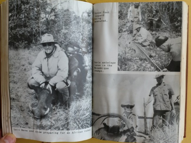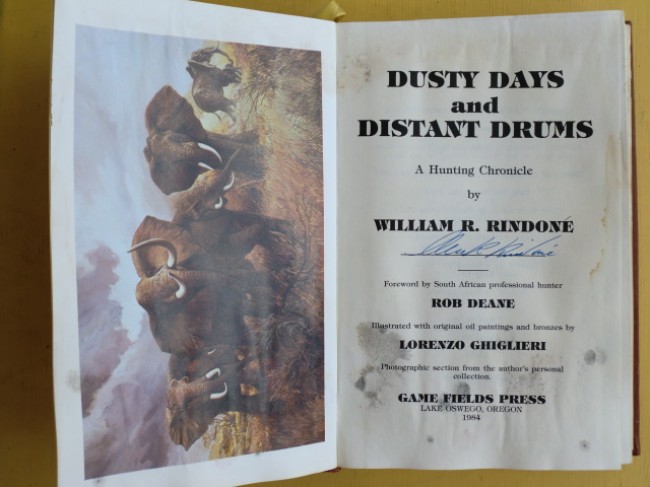 \'A Hunting Chronicle\' with foreword by South African professional hunter Rob Deane, and with illustrations, paintings and bronzes by Lorenzo Ghiglieri, 259pp, 14 chapters, each named after a region, e.g. Kenya, Iran, Mozambique, Sudan, Zululand, Botswana, Rhodesia, Angola, Namibia, Transvaal, and Cameroon. The brown leatherette cover is in very good condition, however internally the book has suffered water soiling resulting in wavy pages and dark mould spots to end-papers, title-page and fore-edge, and other patches of mould spots, water soiling throughout, more on lower half of the text block. The text however is all legible and the photographs and illustrations are all in good shape. Quite a scarce book, signed by the author on the title page.