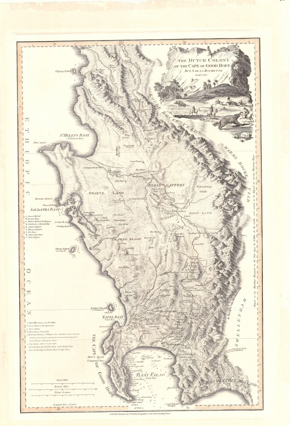 This map was published again in 1825 and 1838 but James Wylde, and then his son, the new owner of the publishing business did not keep up to date with changes in the rapidly expanding colony - they did, however, remove reference to Dutch occupation of the Cape! A German edition of this popular map was published by Schrämbl in 1789. As more up to date maps were published, De la Rochette’s attractive and once popular and important map last was published in 1838 and was of historical interest only.