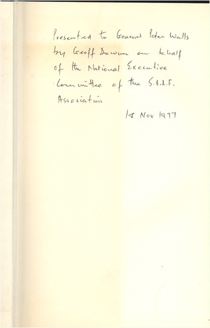 From the library of Lt. Gen. Peter Walls, inscribed to him on the front free endpaper, ‘Presented to General Peter Walls by Geoff Downer on behalf of the National Executive Committee of the S.A.A.F. Association, 1st Nov. 1977.’