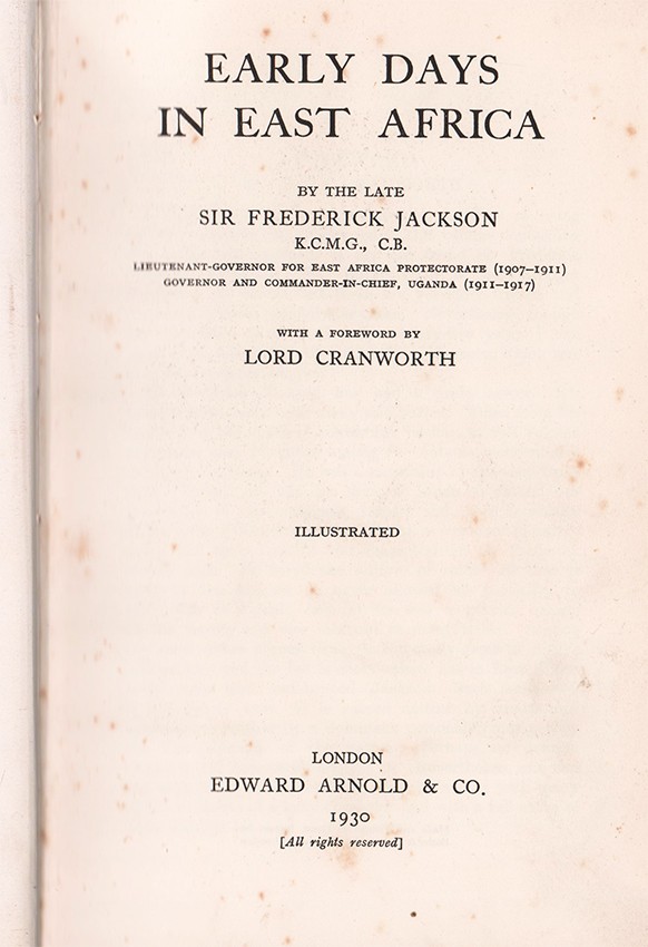 Czech (Kenneth) An Annotated Bibliography of African Big Game Hunting Books 1785-1999 page 138 -139: An administrator in British East Africa, Jacskon recounts his early days hunting around Lke Lamu in the 1880's. Besides hippo, waterbuck, hartebeest, eland and oryx, he bagged buffalo near the Mau Escarpment, and buffalo, elephant and lion near Mt. Elgon. He also relates a failed attempt at the elusive bongo. The author met quite a few well known hunters of the era including Count Teleki, Sir John Willoughby, Buffalo Jones, William Rainsford and others. Of interest are his comments regarding Teddy Roosevelt whom Jackson liked, but decried his over expenditure of ammunition on game. There is also a chapter on professional hunters in general.