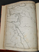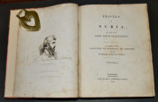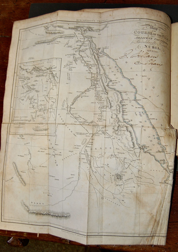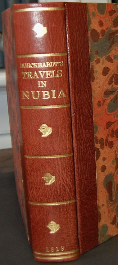 John Lewis Burckhardt. Travels in Nubia. London: John Murray, 1819. First edition (xcii, 543 pp., adverts). Published by the Association for Promoting the Discovery of the Interior Parts of Africa with list of Committee and Association members. Tall quarto, frontis, with two maps, one folding; expertly rebound and with new endpapers in half maroon morocco with matching marbled paper over boards, five raised bands, gilt decoration and titles. Includes Memoir on the Life and Travels of John Lewis Burckhardt, Journeys along the Banks of the Nile, Journey from Upper Egypt through the Deserts of Nubia, Some Notices on the Countries of Soudan, West of Darfour with Vocabularies of the Borgho and Bornou Languages, etc. Found in a disbound state, the text block and accompanying maps were nevertheless well preserved and intact. A very pleasing copy.