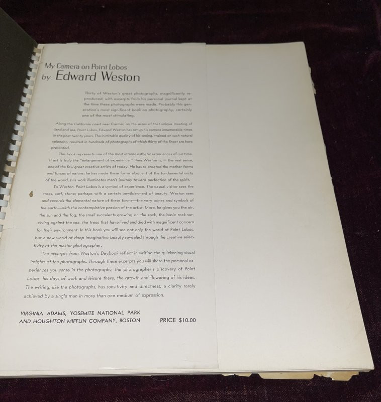 My Camera on Point Lobos. Boston: Houghton Mifflin Co., 1950. 1st Edition. Stiff Paper Covers, Spiral Bound. Very Good/ Jacket laid-in, though in pieces with loss.