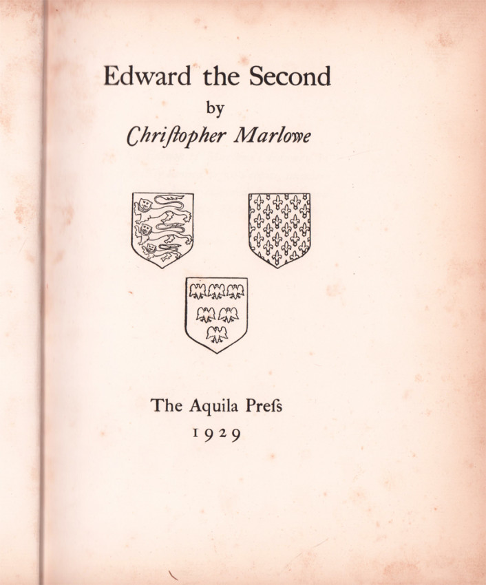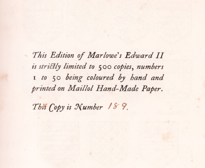 The limitation reads: This edition of Marlowe’s Edward II is strictly limited to 500 copies, numbers 1 to 50 being coloured by hand and printed on Maillal Hand-made paper. This copy is number 189.