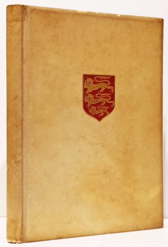 Limited edition: [122] pages, numerous armorial crests in black and white, bound in vellum over bevelled boards, which are soiled, chips in the vellum on the inside of the back cover, the King’s red armorial crest with lions in gilt, on the upper cover, foxing, top edge gilt, others uncut, a fair copy.