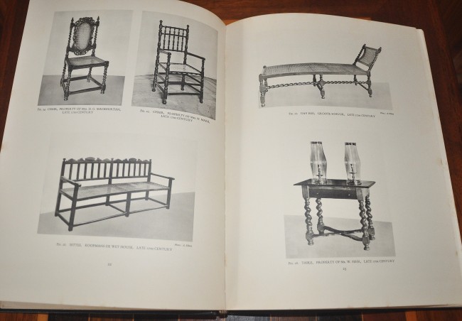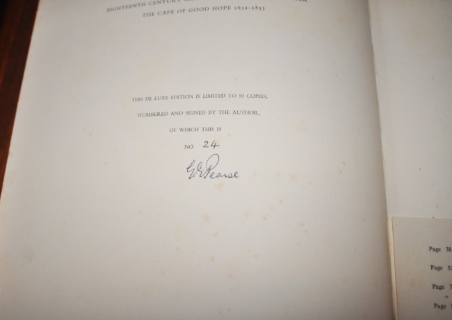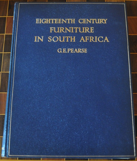 Covers seventeenth and eighteenth century furniture at the Cape and in Holland, as well as chapters on glass, silver and china, and timber. Illustrated throughout with black and white photographs. This is one of 50 leather bound deluxe copies signed and numbered by Pearse. This book is no 24 of the edition. Some light foxing on the preliminary pages and some very minor shelf wear on the bottom edge of the spine and outer corner of the book. Overall a very attractive copy.