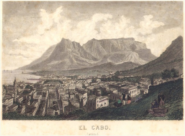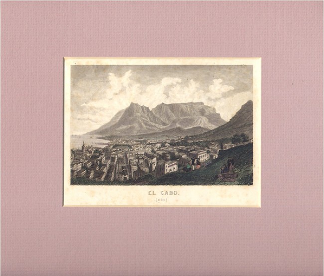 93 x 143 mm, copper engraved view of Cape Town, later coloring, some very light foxing, mounted.