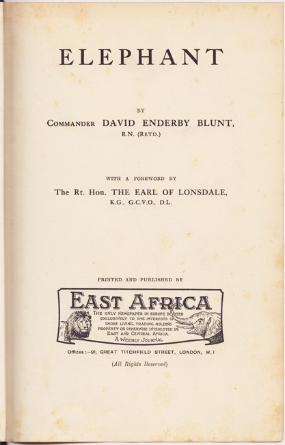 Czech: An Annotated Bibliography of African Big Game Hunting Books 1785 – 1999 (2011), page 30. ‘Blunt was an elephant control officer in Tanganyika, hunting primarily in the Linda Province. He details the natural history and biology of the elephant, relates his experiences as a cultivation officer and provides an excellent chapter on past and future elephant hunters. “I am sure that an elephant looks in human beings in the same way as we look on dangerous insects.” A classic of African elephant hunting.’