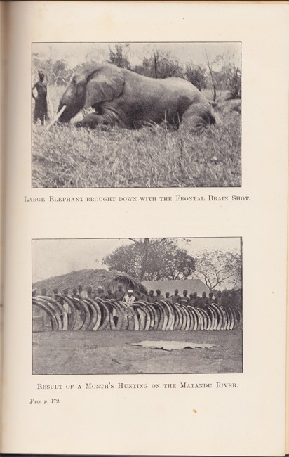 260 pages and 35 pages of advertisements for gunsmiths, safari outfitters, taxidermists, etc., frontispiece, 21 illustrations, original elephant skin grained cloth with the head of an elephant in gilt on the upper cover – the cloth is dull and faded, two centimetre repair to the bottom corner of leaf 149/150 without any loss of text, inscription of a previous owner on the front free endpaper, some light foxing.