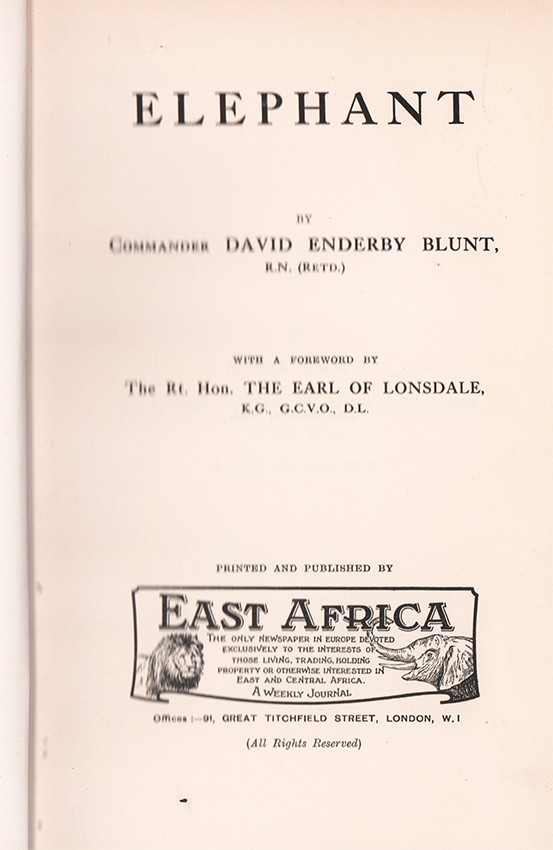 Czech (Dr. Kenneth) An Annotated Bibliography of African Big Game Hunting Books 1785 – 1999, page 30: Blunt was an elephant control officer in Tanganyika, hunting primarily in the Linda Province. He details the natural history and biology of the elephant, relates his experiences as a cultivation officer and provides an excellent chapter on past and future elephant hunters. “I am sure that an elephant looks in human beings in the same way as we look on dangerous insects.” A classic of African elephant hunting.