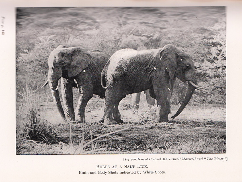 First edition. 260 pages and 35 pages of advertisements for gunsmiths, safari outfitters, taxidermists, etc., frontispiece, 21 illustrations, original elephant skin grained cloth with the head of an elephant in gilt on the upper cover, the gilt title on the spine has faded and is illegible, white marks on the covers ingrained probably in an attempt to cover the book, otherwise a very good copy.