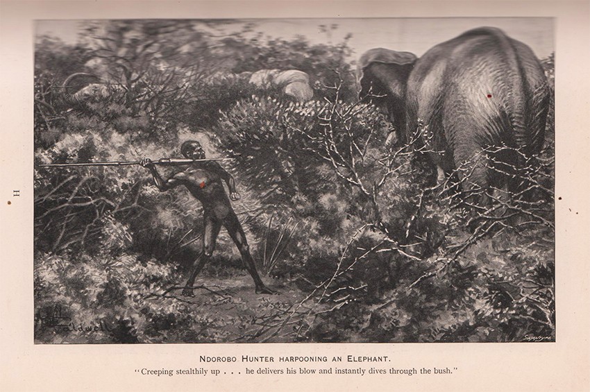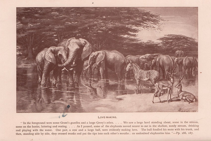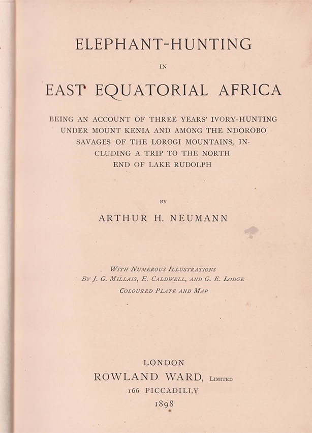 Czech (Kenneth) An annotated bibliography of big game hunting books 1785 -1999 page 207: 'Neumann hunted throughout British East Africa, hunting rhino and oryx near the Mackenzie River, then travelling to the Jambeni Range for elephant, impala, and rhinoceros. Near Mt. Kenya he bagged numerous elephant and also collected rhino and lion. In Ndorobo territory, he stalked more elephant, particularly near the Seya River. On a second expedition, this time toward the Tana River, he again bagged elephant, then returned to Ndorobo lands for further tuskers. On a trek toward Lake Rudolph, Neumann collected topi, lion, rhino, hippopotamus, giraffe, and a variety of plains animals. The coloured plate of butterflies was highly prized by entomologists and was often removed'.