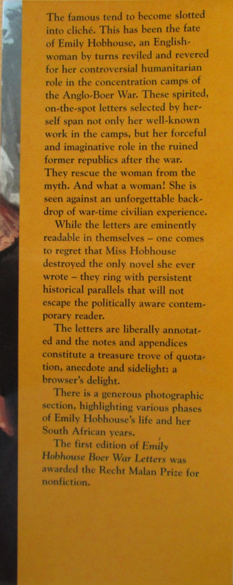 - Emily Hobhouse, by turns reviled and revered for her controversial humanitarian role in the concentration camps of the Anglo-Boer War. These spirited, on-the-spot letters selected by herself span not only her well-known work in the camps, but her forceful and imaginative role in the ruined former republics after the war.