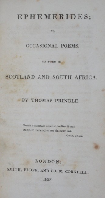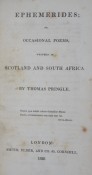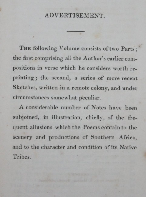 The Scottish poems were written before the poet's departure for Africa, and copious notes, especially on the South African subjects, are annexed. Many contemporary authors, Coleridge among the number, greatly commended the little volume, which is unique in its poetical description of scenes in South Africa, about which little was known up to the time of the publication of the volume". Mendelssohn Vol I Page 186