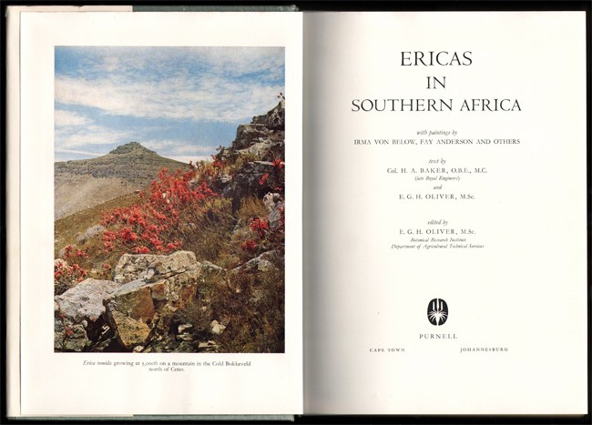 180 pages, colour photographic frontispiece - Erica Tumida growing at 5,000 ft on a mountain in the Cold Bokkeveld north of Ceres, 167 colour plates, 2 further colour plates reproduced from Bauer\'s Deliniations of Exotick Plants (1796) and Andrews\' Coloured Engravings of Heaths (1802), 2 black & white illustrations and sketch figures in the text, 2 maps - 1 folding, 2 portraits of Francis Guthrie and Harry Bolus to whom the book is dedicated, green cloth, very good copy in the dust jacket.