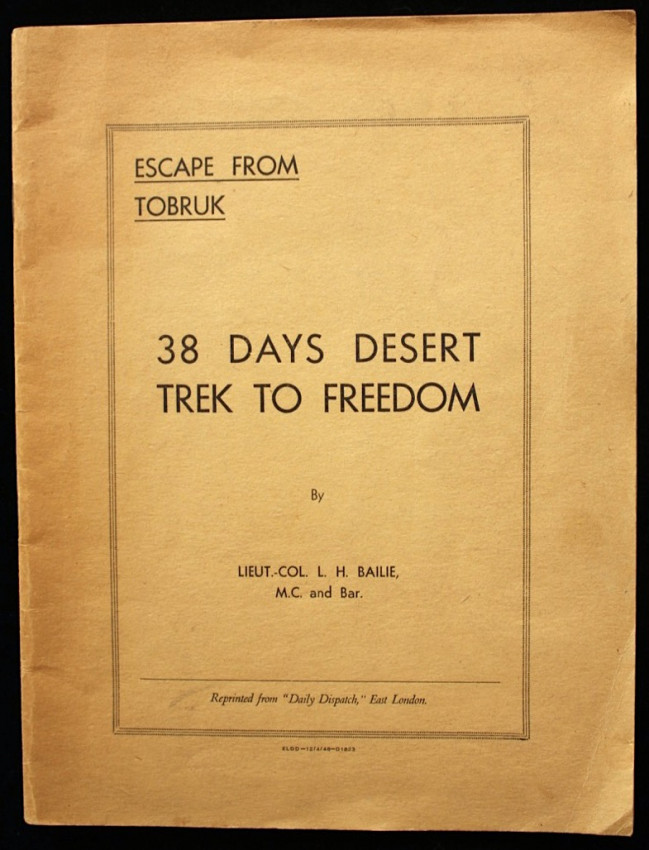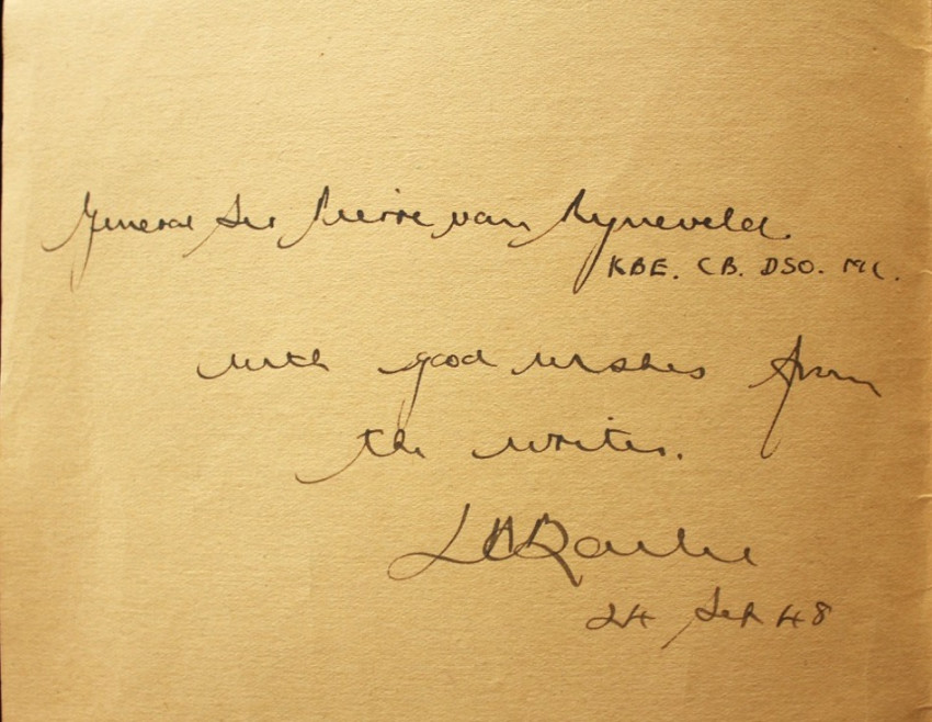 Author's presentation inscription on the inside of the front cover, "General Sir Pierre van Ryneveld KBE. CB. DSO. MC., with good wishes from the writer, L.H. Bailie, 24 Sep. 48."