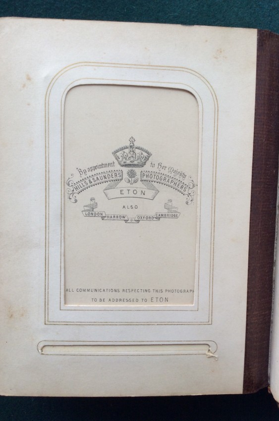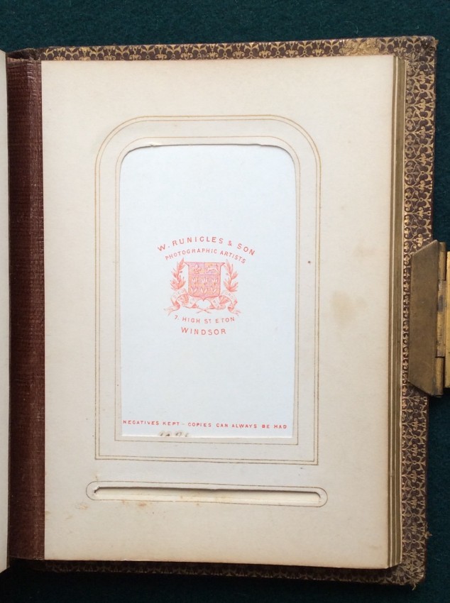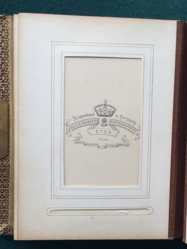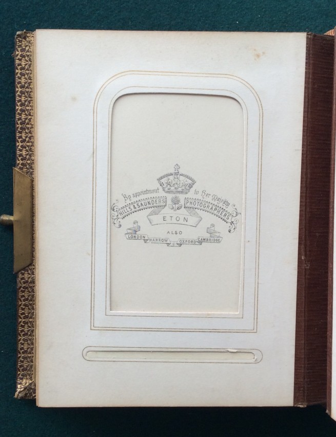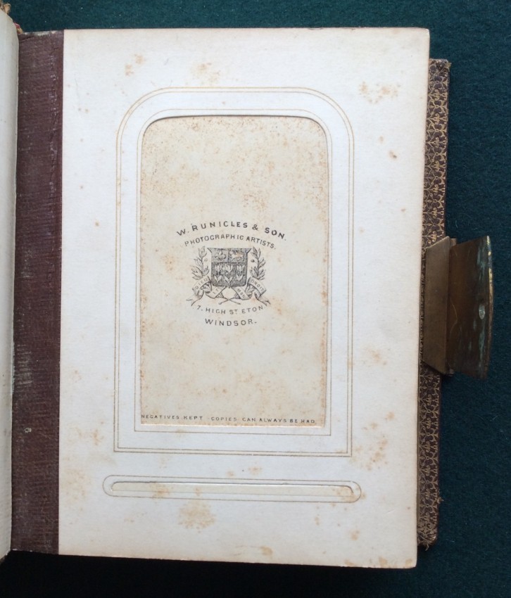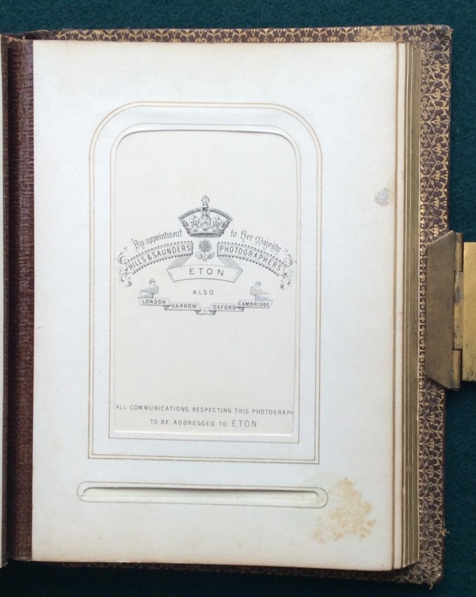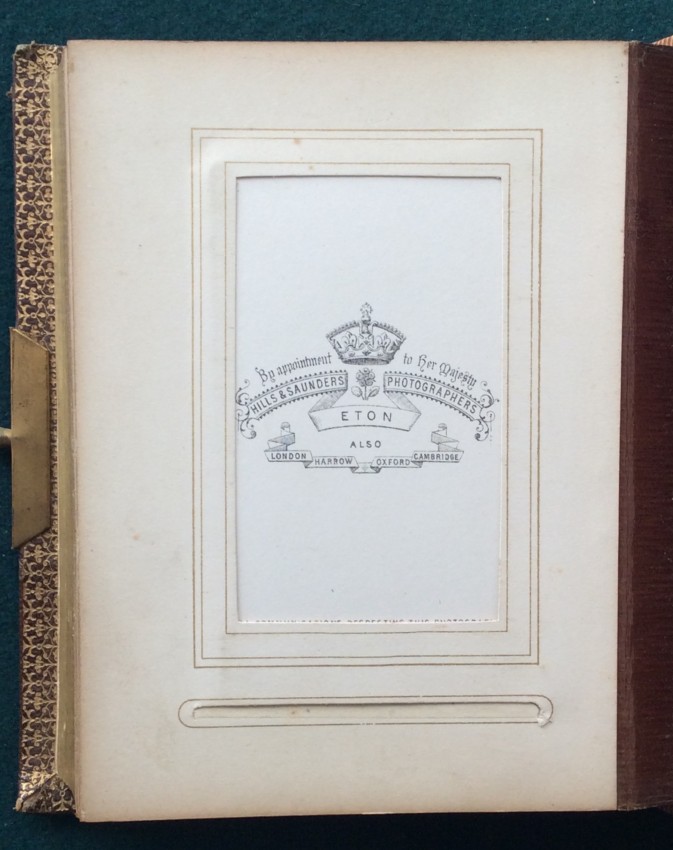 [Eton, Windsor and elsewhere: c.1870 - 1875]. Square octavo album (5 ¾ x 4 ½ inches; 146 x 108mm.), 25 card leaves with variously shaped openings recto and verso, allowing for the display of up to fifty images, the album retailed by Parkins & Gotto, of Oxford St., London (with their gilt stamp on the front pastedown), photographers include W. Runicles of Eton; Hills & Saunders of Eton,[etc.]; Elliot & Fry of London; James Russell & Sons of Worthing; F.Raps of Coeln; and B.C. Paice of Windsor. (Some fading and spotting).