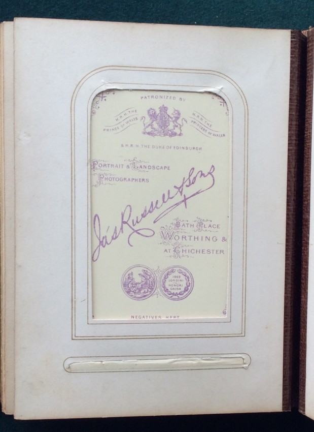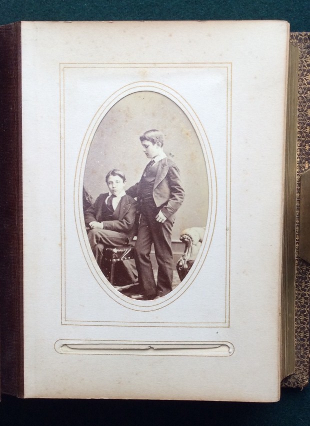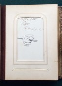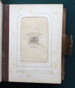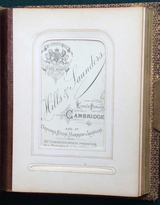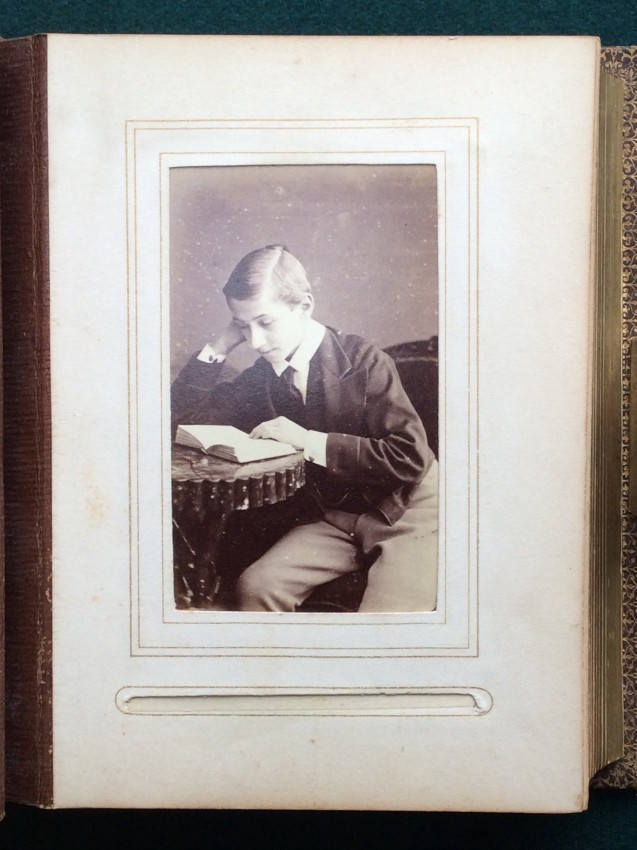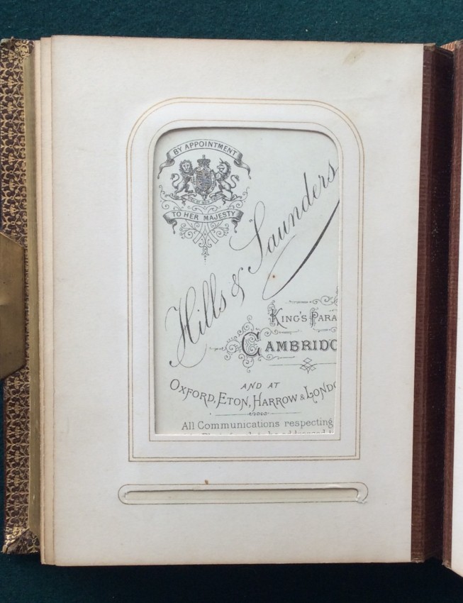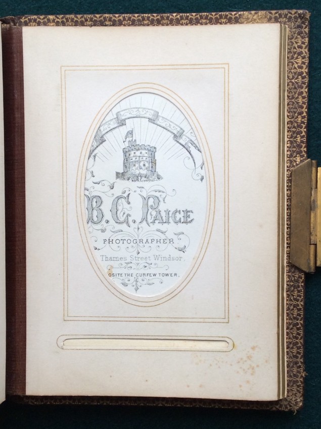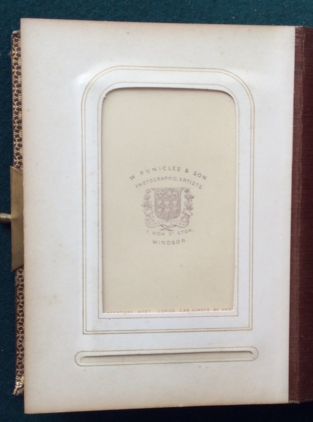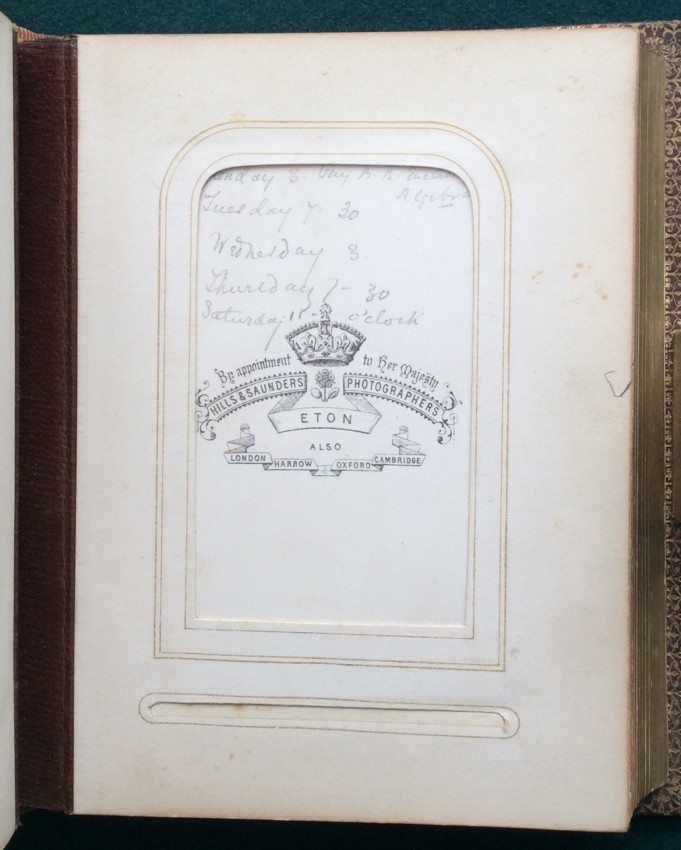 [Eton, Windsor and elsewhere: c.1870 - 1875]. Square octavo album (5 ¾ x 4 ½ inches; 146 x 108mm.), 25 card leaves with variously shaped openings recto and verso, allowing for the display of up to fifty images, the album retailed by Parkins & Gotto, of Oxford St., London (with their gilt stamp on the front pastedown), photographers include W. Runicles of Eton; Hills & Saunders of Eton,[etc.]; Elliot & Fry of London; James Russell & Sons of Worthing; F.Raps of Coeln; and B.C. Paice of Windsor. (Some fading and spotting).