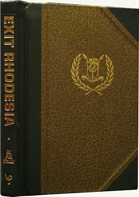 227 pages, maps, illustrations and newspaper cartoons, half green leather and green vynide sides – titled gilt on the spine and with the Rhodesian coat of arms on the upper cover, some light foxing on the page edges.