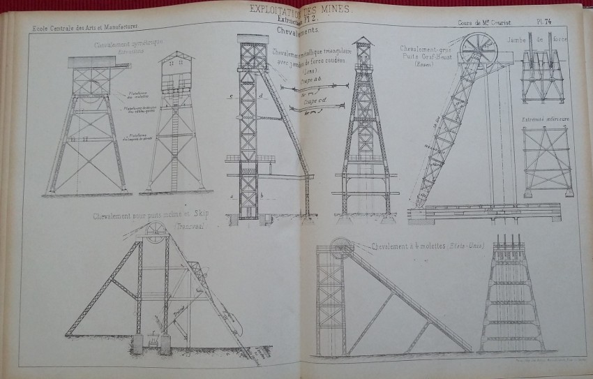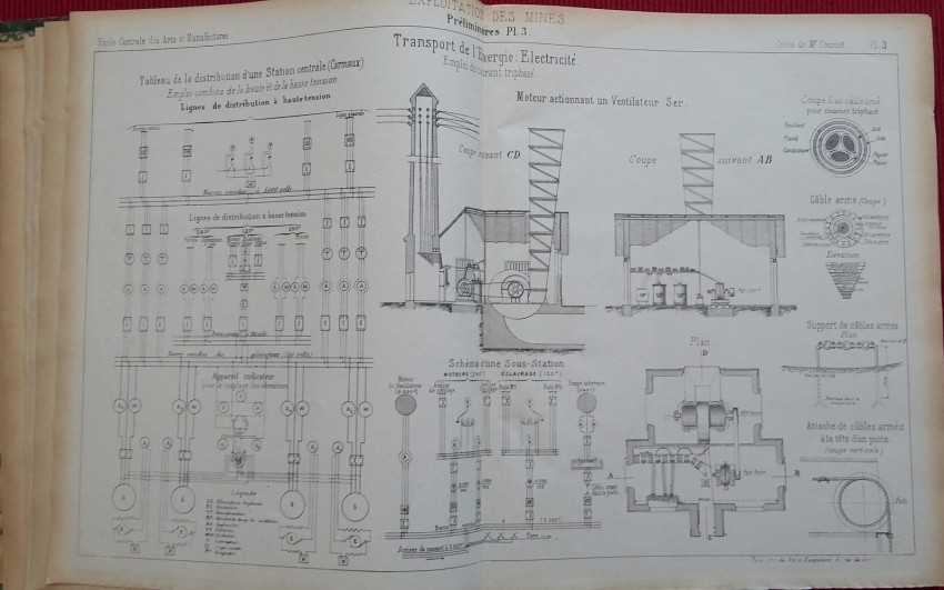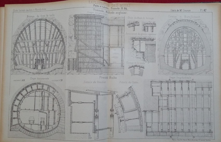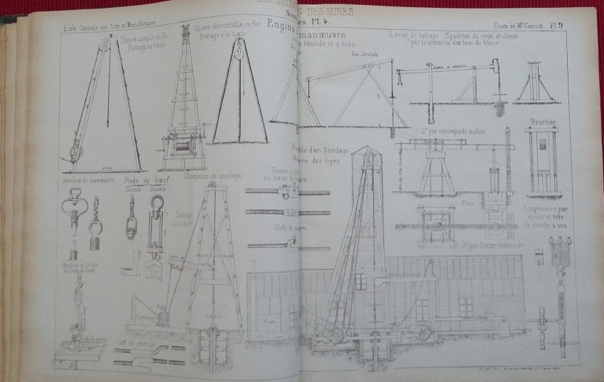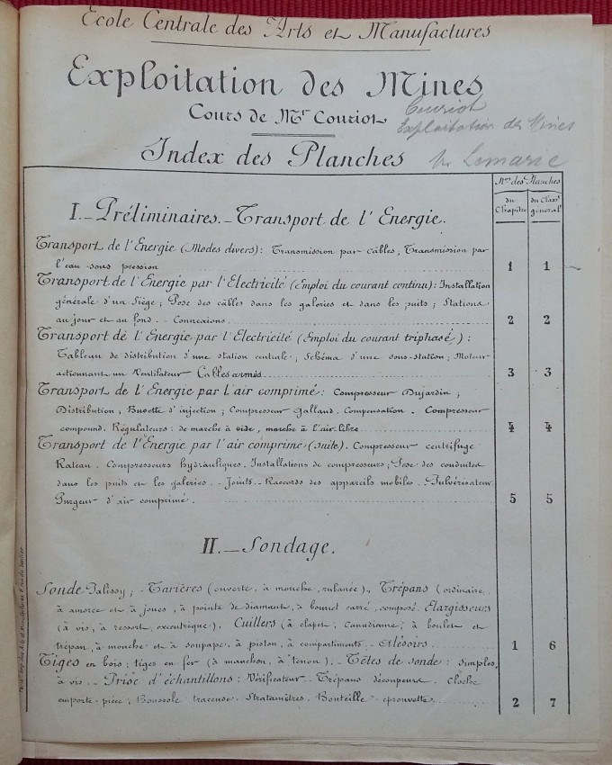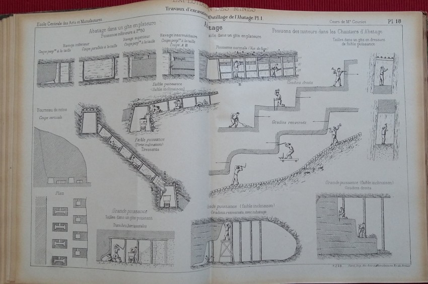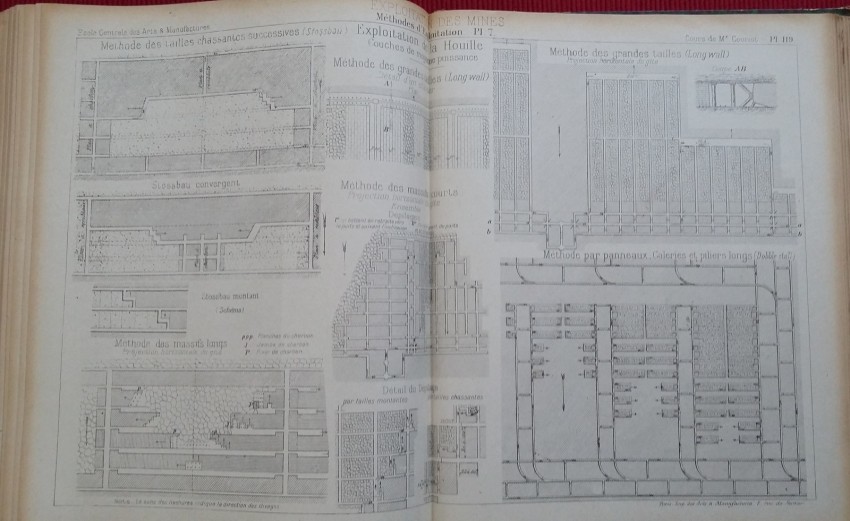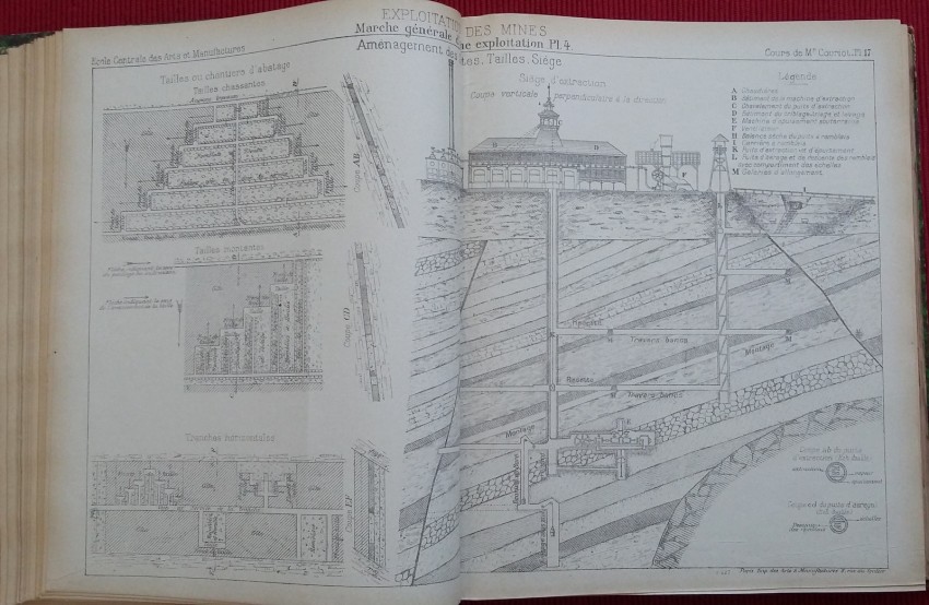 List of Chapters (translated from French): Preliminary. Transport of the force. Survey. Research and General walk in operating system. The work of excavation and equipment of the abatage. Wells, galleries and tunnels. Ventilation, lighting. Underground transport. Extraction, travel of staff, lowering of the embankments. Dryer, pumping. Methods of operating system. The seats of operation, external transport, manipulation.