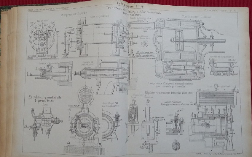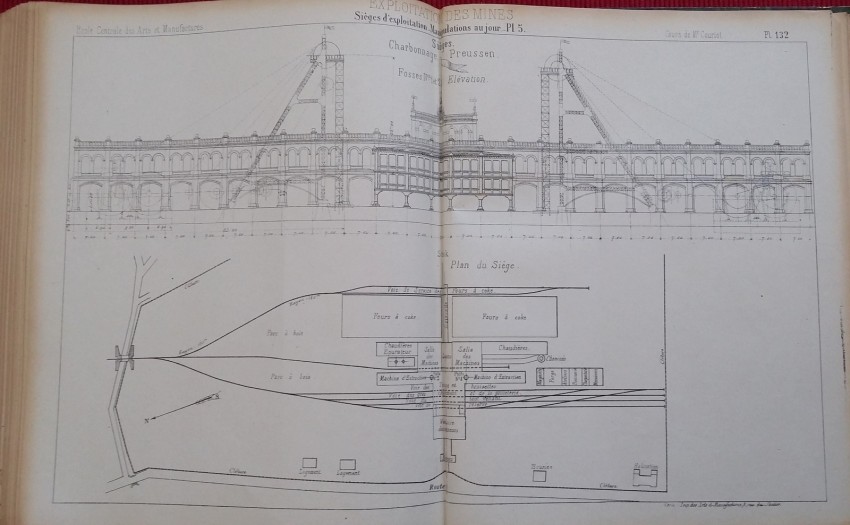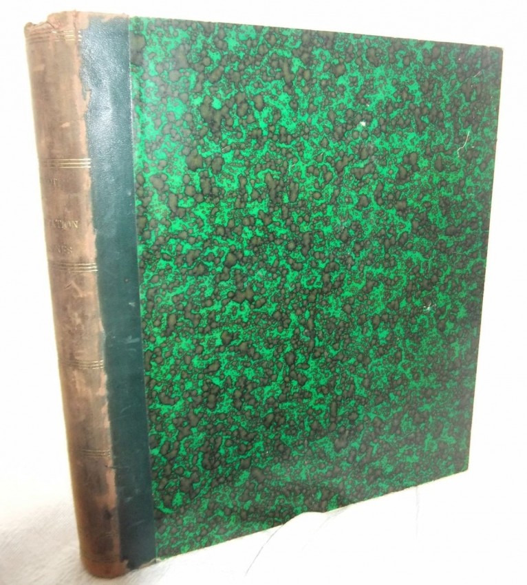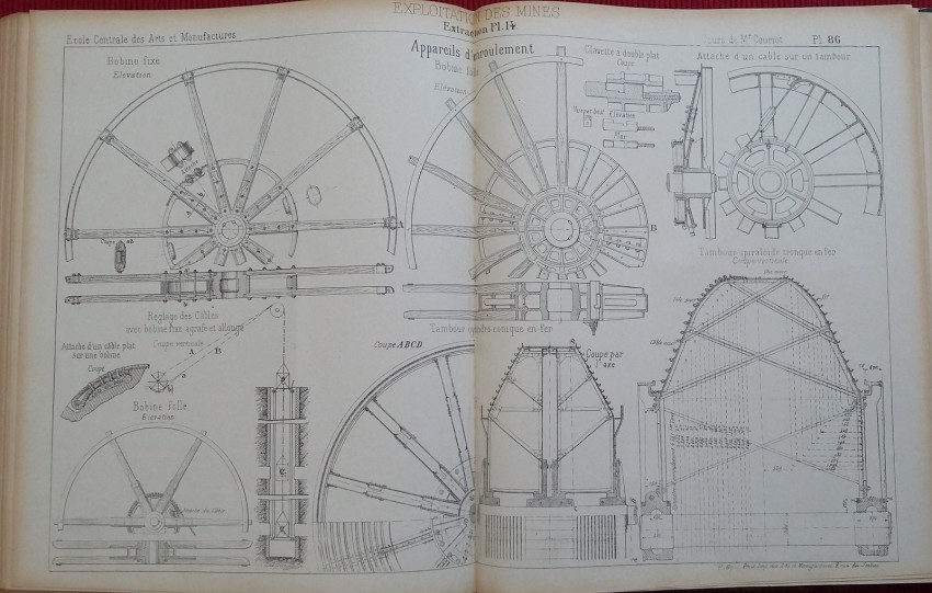 "Exploitation des Mines. Cours de Mr Couriot a l'Ecole Centrale des Arts et Manufactures. Lithographies & autographies"; Collation complete - XII (Index of plates) + 164 lithographed double plates; Text in French; Binding is tight and firm. Leather spine and marbled cartonage boards scuffed and bumped, partly chipped to the extremities. Traces of wetting to the lower corner of back board and last few blank pages. Pages/text block in very good condition, with some age toning/yellowing and occasional light foxing.