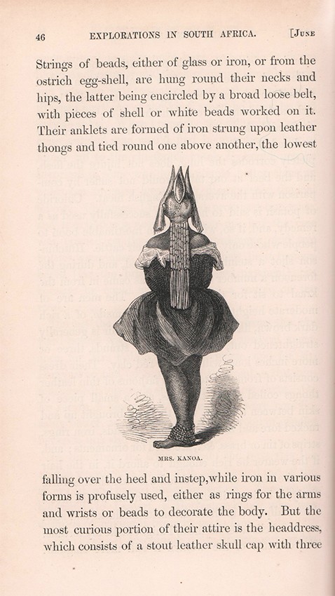 Mendelssohn (Sidney) South African Bibliography volume 1, page 69 -70: The journey was started on March 20, 1861, and the author was joined by his fellow-traveller, Mr. J. Chapman, on the 20th of July. The volume contains an interesting account of hunting and exploration in the country of the Namaquas and Damaras, and the illustrations are very spirited; there is a good description of the flora and fauna of the country, together with an account of the habits of the natives. It is stated that Livingstone, who had travelled over some of these regions, was often indistinctly under stood by the natives, and that he made errors in consequence, the natives themselves averring that Scotchmen, however perfectly they may understand the language of the country, invariably speak it with an idiom that renders them more or less unintelligible.