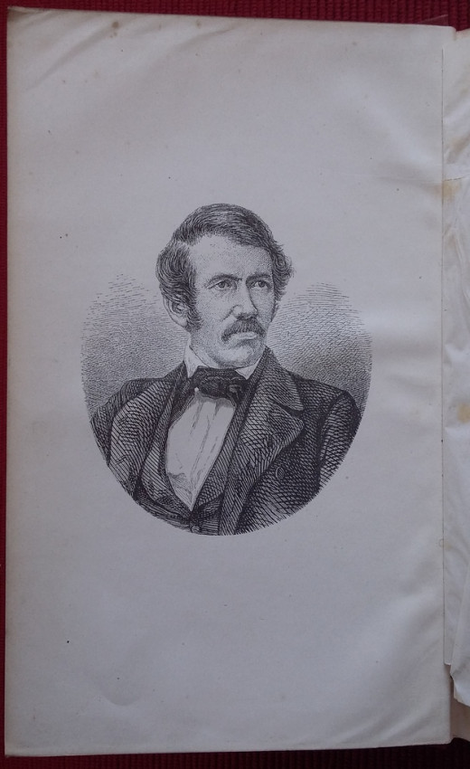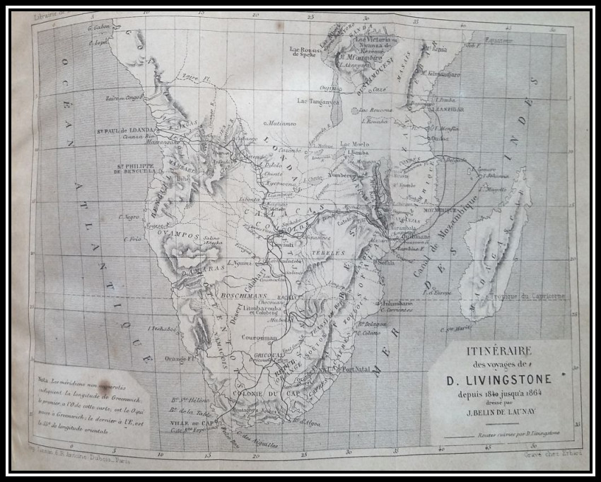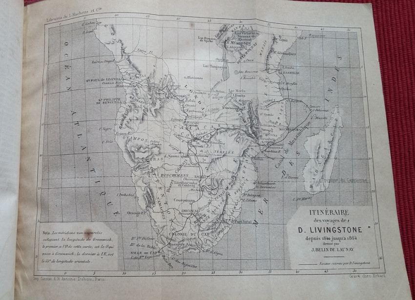 This French translation from 1869 of a famous travel and exploration book contains 20 woodcuts and folding map which shows a route of travel of David Livingstone since 1840 until 1864.