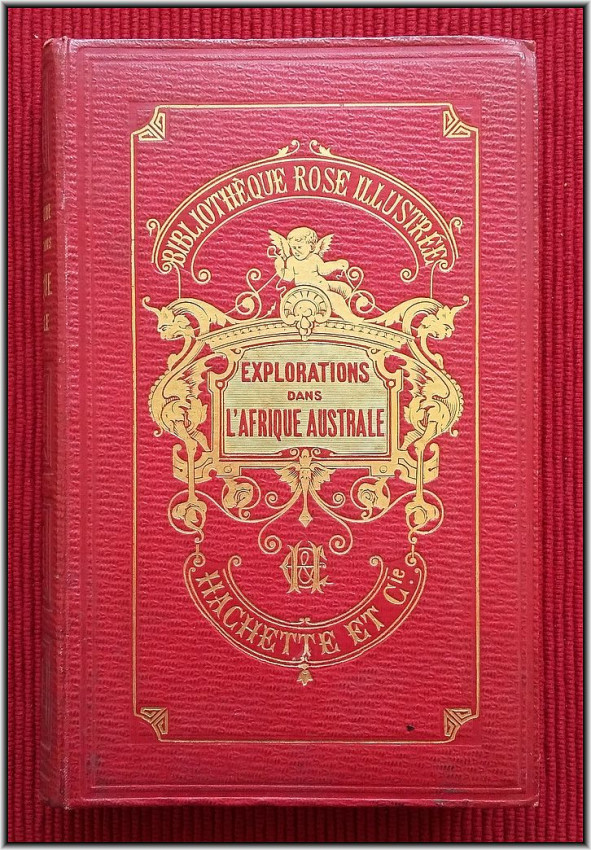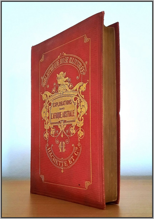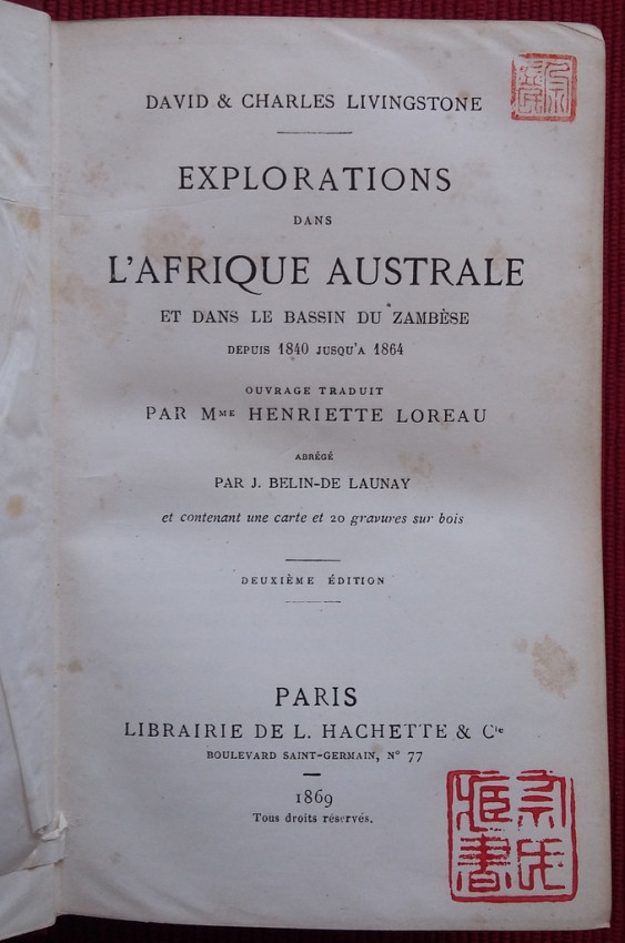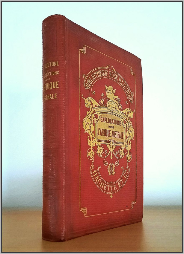 "Explorations dans l'Afrique Australe et dans le bassin du Zambeze depuis 1840 jusqu'a 1864. Ouvrage traduit par Mme Henriette Loreauabrégé par J. Belin de Launay"; Full percaline red hardcovers with gilt decoration. All page edges gilt; Text in French; Collation complete – Frontispiece with a portrait of D. Livingstone, Title page, [XIX], 339 pages, with folding map at the rear; Binding is tight anf firm, little bumped to the extremities, overall in very good condition. Pages/text block with some yellowing and occasional light foxing. Ex libris stamps to the title page.