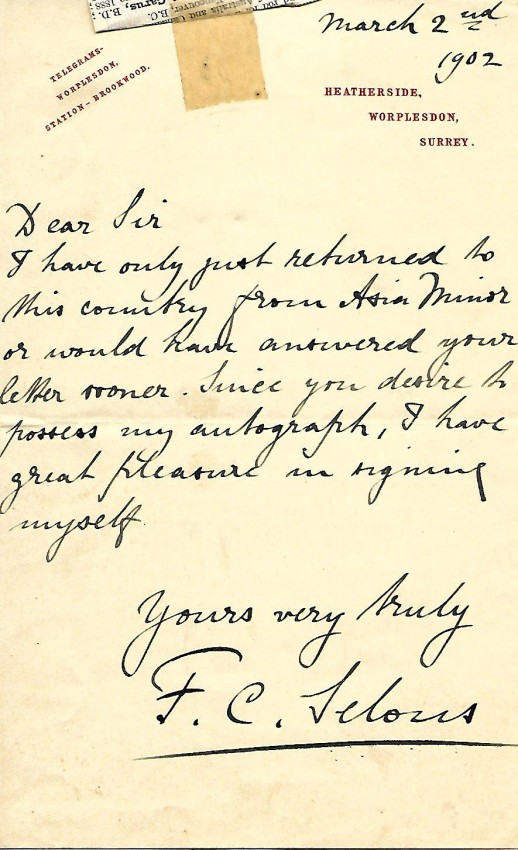 A 1pp. autograph letter signed by the famous hunter. Dated March 2nd. 1902 and on a letterhead addressed "Heaterside, Worplesdon, Surrey". Having just returned from Asia Minor, he is happy to provide his autograph as requested by the recipient. Not a major letter but equally not a common signature. In very good condition apart from a piece of tape at the top, attaching a newspaper clipping to the letter, not affecting the text.