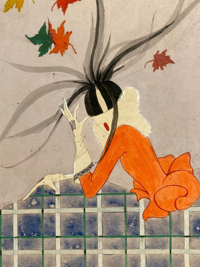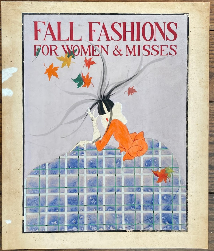 Original artwork for a display “Fall Fashions for Women & Misses” [New York: undated but circa 1920?]. watercolor and bodycolor on artist’s board (23 x 19in; 584 x 483mm), pencil inscription to verso [see images]. (Some smudging and light soiling).