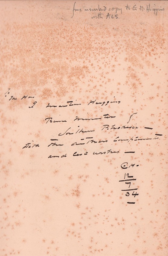 Inscribed on the front free end paper to G.M. Huggins ‘With the authors compliments and best wishes’ and signed by the author dated 12/7/34. There is also a letter to G.M. Huggins loosely inserted in the front by the author asking him to accept a copy of this book.