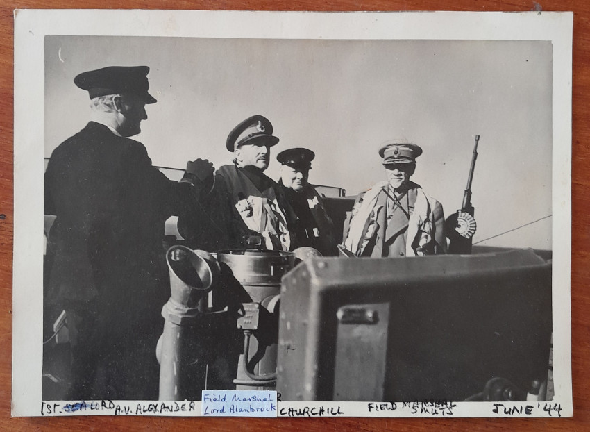 2) Black and white photograph dated June '44, featuring Winston Churchill, Jan Smuts and others during the Second World War. Photographer unknown. Size: 12x16.5cm.