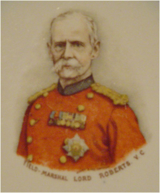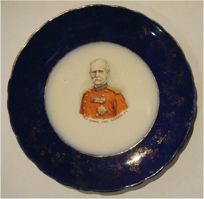 Blue plate with gilt design and border with a white centre and a portrait of Roberts. "Field-Marshall Lord Roberts, V.C," Maker's mark on the back, Stanley Pottery, Co., Burslem, England beneath a crown.