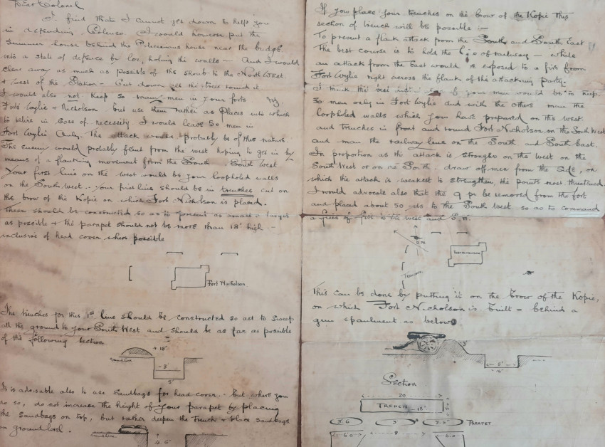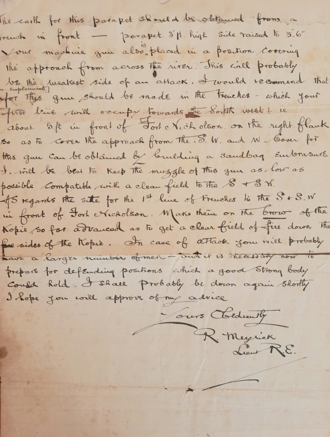 Meyrick advises the Colonel not "to keep so many men in your forts... Fort Wylie & Nicholson... I would leave 50 men in Fort Coylie alone... Your first line on the west would be your loopholed walls on the South West. Your first line should be in trenches cut on the brow of the kopie on which Fort Nicholson is placed".