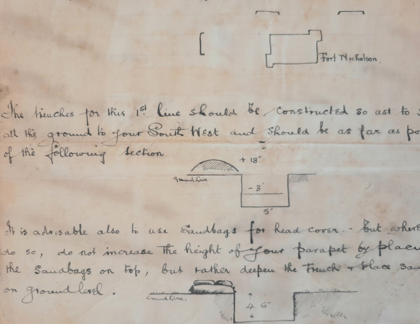 Meyrick points out in detail where the trenches should be positioned and constructed which is illustrated via six sketches. He also advises on the positioning of parapets, machine guns and soldiers.