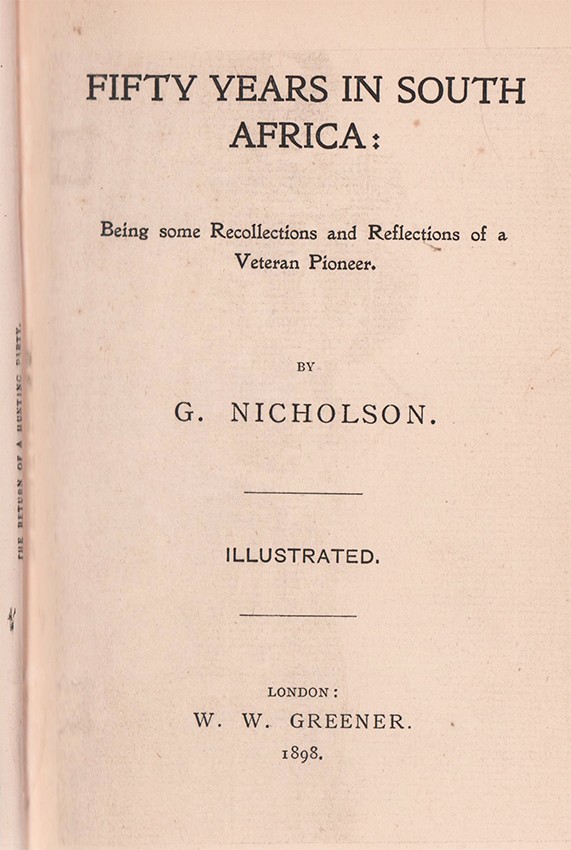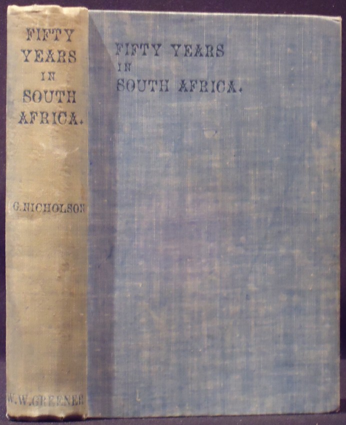 Mendelssoh (Sidney) South African Bibliography volume 2 page 101 -102: In a Preface which is dated from Robertson, Cape Colony, the author states that he left England for the Cape in 1844, and he gives a short sketch of the colony at this period, together with some information concerning the " little Boer Republics in an embryonic and tentative condition, in the territories now known as the Orange Free State and Transvaal. ..." Mr. Nicholson bought a farm near the Sneeberg range of mountains and stocked it, but after two years sold it at a profit and " cleared out for the interior," and he affords an account of his hunting expeditions, in the course of which he came in contact with Gordon-Cumming (whom he constantly alludes to as Cummings), Oswell, and David Livingstone.