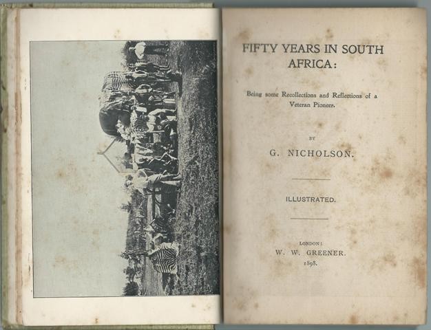 Nicholson arrived at the Cape in 1844 and had a number of "exciting pioneer experiences". The Spectator in reviewing this book in 1898 concluded that Nicholson's "... thinking and writing are as direct as we imagine his shooting is...".