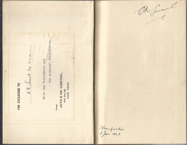This copy belonged to Charles Robberts Swart, long-serving Nationalist MP since 1923, who became Minster of Justice in 1948 and was also the last Governor General of the Union until 1961, and subsequently the first State President of the Republic of SA. It has a presentation slip to him in prelims and bears his signature on the front endpaper.