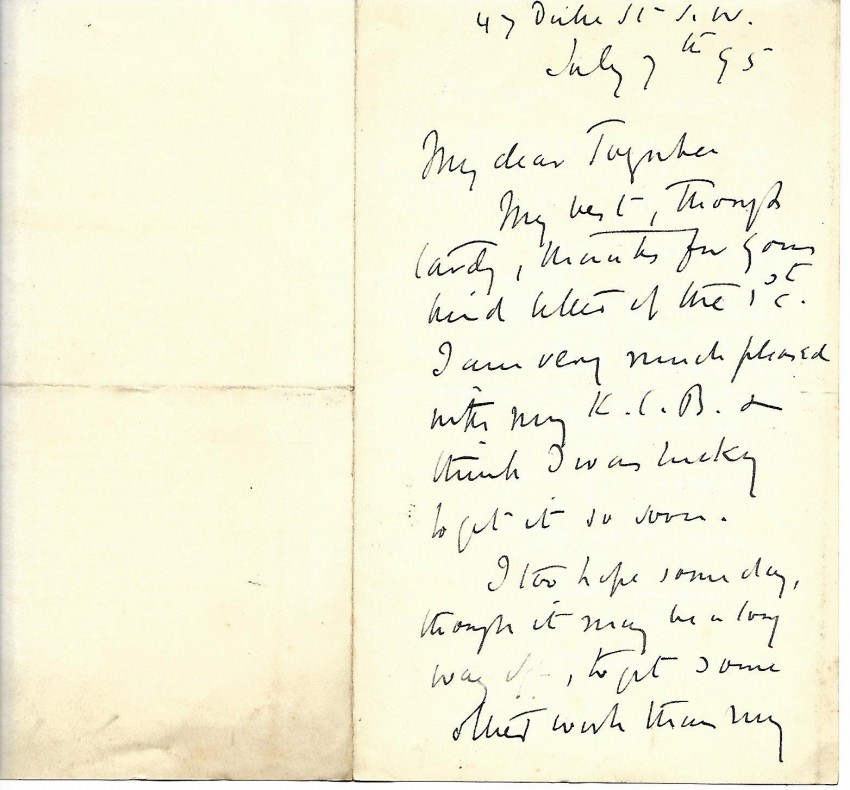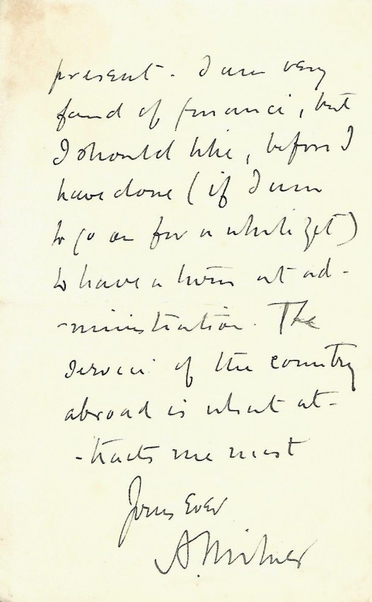 A fine 2pp. autograph letter from Alfred Milner dated July 7th. '95 to Toynbee (probably Harry Valpy Toynbee, father of the well known historian). Milner thanks Toynbee for his congratulations for his been awarded the K.C.B. "I think I was lucky to get it so soon. I hope too to someday, though it may be a long way off, to get some other wish than my present. I am very fond of finance, but I should like, before I am done (if I am to go on for while yet), to have a turn at administration. The service of the country abroad is what attracts me most." On the front and rear first page of a folded leaf. There is a stain on the blank second page but the letter itself is in very good condition.